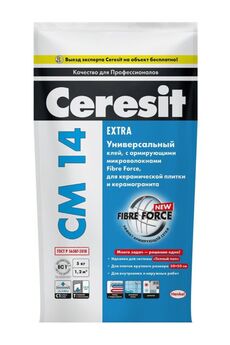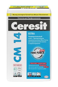 Церезит CM 17 Эластичный клей с армирующими волокнами Фибра Флекс для любых видов плитки Свойства эластичный, устойчив к деформациям; подходит для облицовки каминов и печей, полов саун и хаммамов, поверхности которых не нагреваются выше +80°C; обладает высокой адгезией; водо- и морозостойкий; устойчив к сползанию плитки; может применяться на гипсокартоне и ДСП; идеален для бассейнов и стяжек с подогревом; пригоден для укладки плиток крупного размера; совместим с гидроизоляционными материалами Церезит CR 65, CR 166 и CL 51; пригоден для внутренних и наружных работ; экологически безопасен Эластичный плиточный клей, высокая прочность, подходит для крупной плитки и системы "тёплый пол". Для внутренней и наружной отделки.