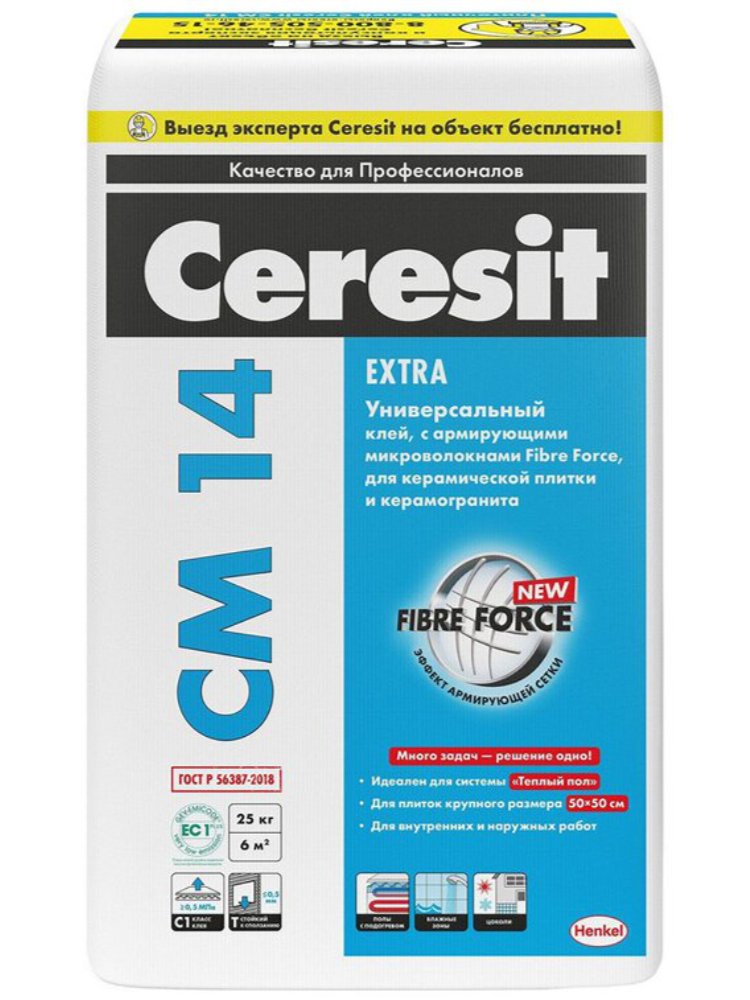 Надежное решение для прочной и долговечной облицовки пола и стен! Клей для плитки 25кг Ceresit СМ-14 – оптимальный выбор для укладки керамической, керамогранитной плитки и искусственного камня внутри и снаружи помещений, включая ванные, кухни, балконы и террасы.
