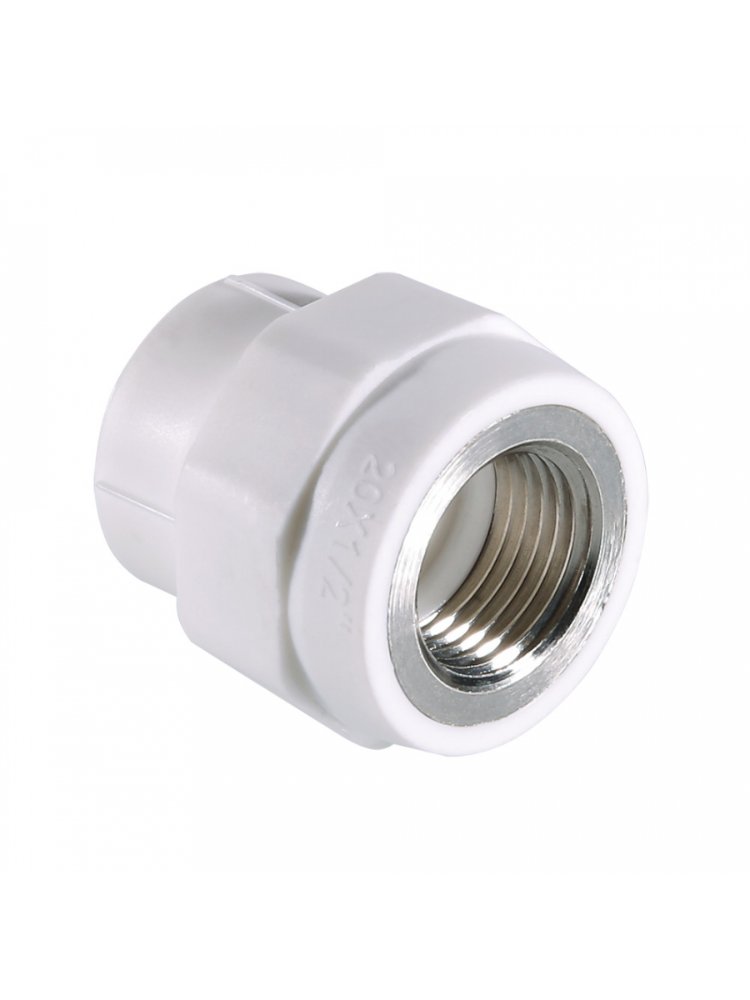 Комбинированная муфта PPR с внутренней резьбой 20x1/2 дюйма для надёжных и герметичных соединений пластиковых и металлических труб.