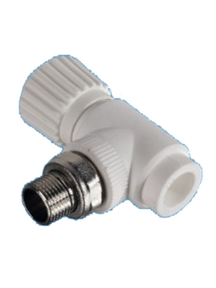 Угловой клапан для регулировки потока воды в PPR-системах, устойчив к коррозии, прост в установке, подходит для отопления и водоснабжения.