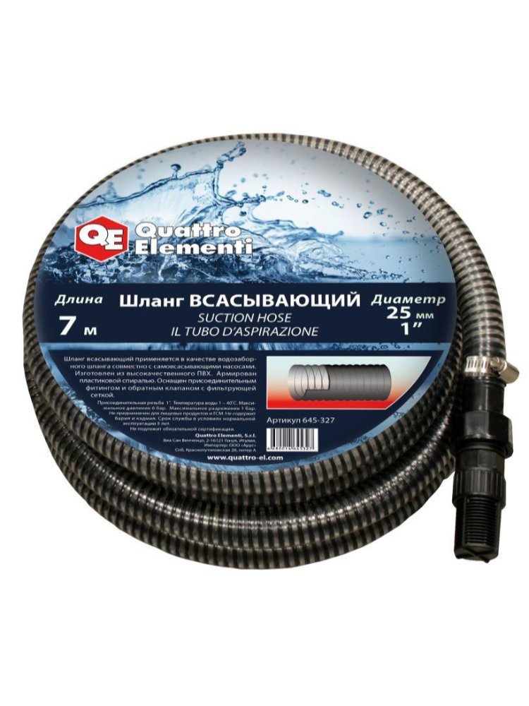Шланг садовый всасывающий Quattro Elementi - принадлежность к садовым поверхностным насосам и автоматическим насосным станциям для осуществления водозабора. Шланг изготовлен из высококачественного ПВХ. Имеет спиральное армирование стальной проволокой. Оснащается обратным клапаном и резьбовым фитингом 1". Армированный шланг 7 м с обратным клапаном для насосов, предотвращает слив воды, устойчив к повреждениям, подходит для строек и дачи.